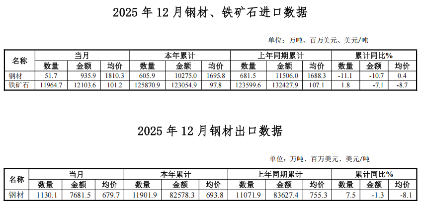 根據(jù)海關(guān)統(tǒng)計(jì)快訊數(shù)據(jù),2025年12月,我國(guó)進(jìn)口鋼材51.7萬(wàn)噸,環(huán)比增加2.1萬(wàn)噸、增幅4.2%;均價(jià)1810.3美元/噸,環(huán)比上漲179.0美元/噸、漲幅11.0%。1-12月累計(jì)進(jìn)口鋼材605.9萬(wàn)噸,同比減少75.6萬(wàn)噸、降幅11.1%。