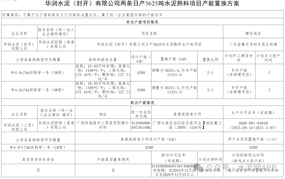 置換方案顯示,華潤(rùn)水泥(上思)公司退出一條4500t/d熟料生產(chǎn)線,產(chǎn)能用于補(bǔ)充華潤(rùn)水泥(封開)公司3#、4#兩條4500t/d熟料線,補(bǔ)齊后兩條線產(chǎn)能為5625t/d,置換比例2:1。