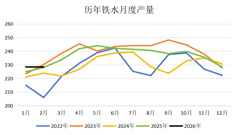 從歷年鐵水的數(shù)據(jù)來(lái)看,節(jié)后鋼企產(chǎn)量恢復(fù)速度較快,2026年初的鐵水產(chǎn)量處于歷史同期高位水平,且市場(chǎng)對(duì)未來(lái)需求持較大疑問(wèn),今年節(jié)后產(chǎn)量預(yù)計(jì)會(huì)逐漸恢復(fù),但恢復(fù)速度還有待觀察。